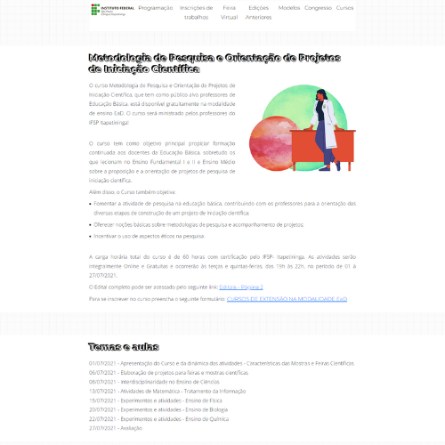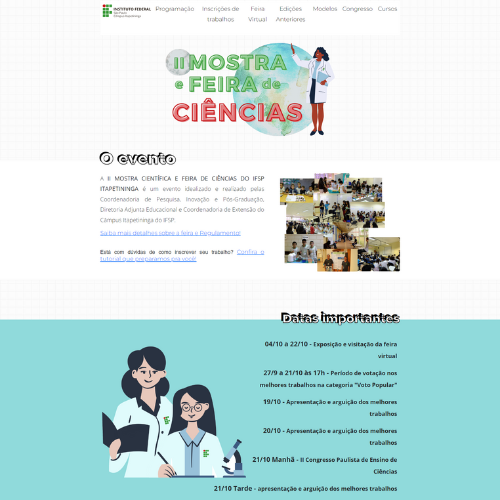A II MOSTRA CIENTÍFICA E FEIRA DE CIÊNCIAS DO IFSP ITAPETININGA é um evento idealizado e realizado pelas Coordenadoria de Pesquisa, Inovação e Pós-Graduação, Diretoria Adjunta Educacional e Coordenadoria de Extensão do Câmpus Itapetininga do IFSP.
